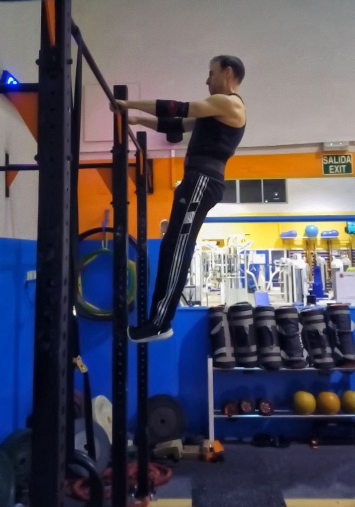 Para conseguir el ángulo de 90º, se suele utilizar la ayuda de un compañero que haga fuerza hacia fuera de la barra.