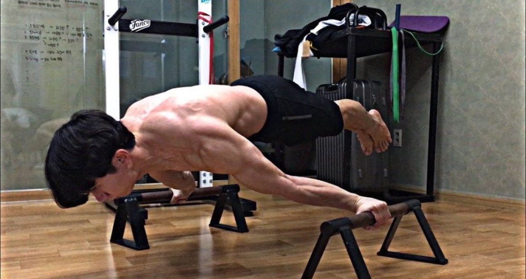 Esta es la versión «fácil» de la full planche. Se diferencia en que las piernas estan abiertas lo cuan facilita el aguante, pero sigue teniendo una gran presión sobre los hombros y los codos.